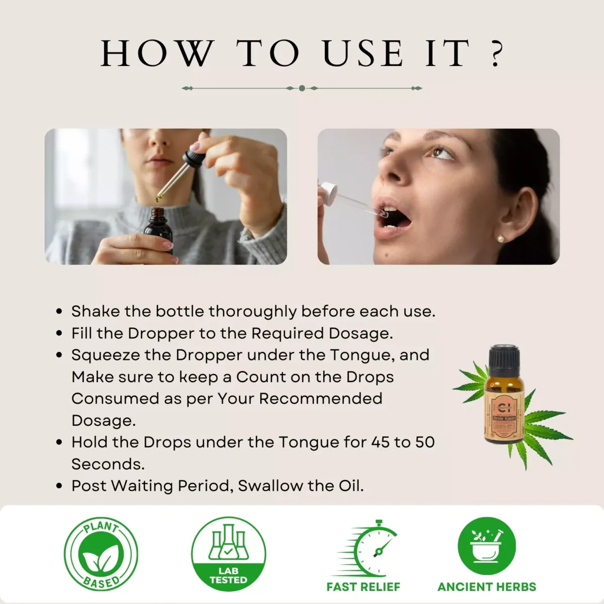 Squeeze the dropper under the tongue, and make sure to keep a count of the drops consumed as per your recommended dosage.